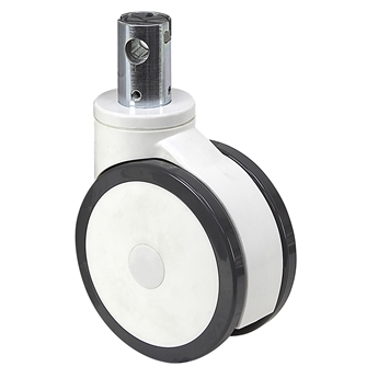 New, RHOMBUS model# 383R40K125VK985 round stem caster with polyamide housing and three-position central brake. Intended for use with hospital beds. Braking mechanism operated by rotating 11mm (0.433") hex in crosshole, has positions for both directional lock and total lock.